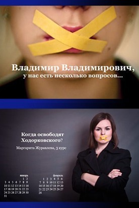 俄媒報道稱,此次的“另類”日歷照同樣來自莫斯科大學新聞系女學生。照片上的女大學生不再暴露身體,而是身著黑色套裝。令人注意的是,她們的嘴都用黃色膠條封住。每個日歷照都有女大學生向普京提出的自己無法理解或無法接受的問題。比如,有女學生寫道:“何時釋放霍多爾科夫斯基(其被視為普京宿敵)?”