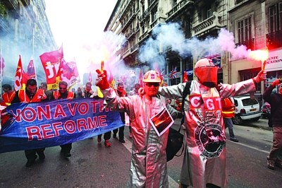 由于法國總統(tǒng)薩科齊執(zhí)意進(jìn)行養(yǎng)老金改革,即準(zhǔn)備將最低退休年齡由60歲延長至62歲,領(lǐng)取全額政府退休金的年齡則從65歲提高至67歲。這讓法國工會組織十分不滿。為了逼迫政府讓步,連日來,他們發(fā)動了數(shù)次罷工和示威游行。截至當(dāng)?shù)貢r間16日,罷工潮已席卷法國大多數(shù)地區(qū)。