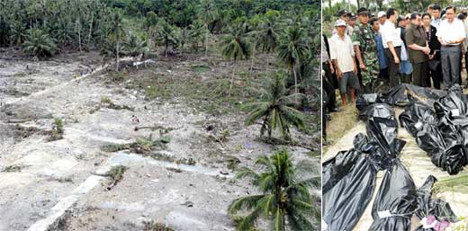 海底強(qiáng)震引起的致命海嘯發(fā)生兩天后,傷亡人數(shù)持續(xù)增加。最靠近震中、受創(chuàng)最深的明打威島煉,救難人員之前由于氣候惡劣無法登陸,裝載16噸的帳篷、藥品、食物和衣物的貨機(jī),總算于27日下午抵達(dá)。由于挖墓的人力不足,仍可見到遺體散布在海邊及路邊。