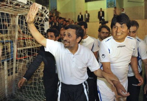 中新網(wǎng)10月29日電 據(jù)外電報(bào)道,伊朗總統(tǒng)穆罕默德·內(nèi)賈德和玻利維亞總統(tǒng)莫拉萊斯長(zhǎng)久以來(lái)因相似的政治立場(chǎng)和對(duì)美國(guó)的尖銳批評(píng)而為世界所矚目,F(xiàn)在,他們又站在同一陣營(yíng)中,不過(guò)這一次是在五人制足球場(chǎng)上。