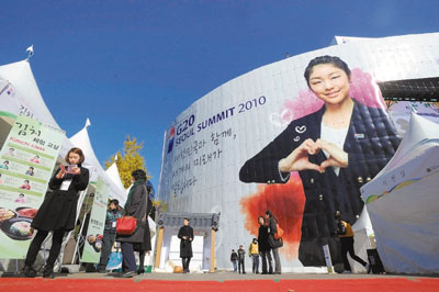 峰會主辦方別出心裁,推出峰會宣傳大使,是G20峰會歷來第一次。結(jié)果,冬奧會金牌得主、當(dāng)紅滑冰選手金妍兒和足球運(yùn)動員樸智星,以及憑《燦爛的遺產(chǎn)》竄紅的韓孝珠當(dāng)選。