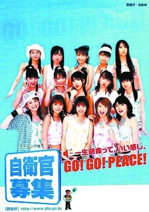 此外,日本自衛(wèi)隊(duì)還精心推出了一套征兵海報(bào),其主角是日本流行的美少女組合。十多個(gè)青春靚麗,穿著“清涼”的少女,呼喚著“前進(jìn),前進(jìn),為了和平!”確實(shí)對于動(dòng)漫和流行音樂熏陶下成長起來的日本新一代有著別樣的吸引力。