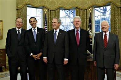 布什和奧巴馬講話后,五任總統(tǒng)站在美國總統(tǒng)橢圓辦公室合影,資格最老的卡特和老布什一左一右站在兩邊,每個人都露出了紳士的笑容。
