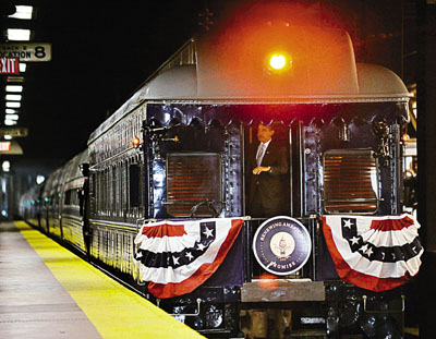 奧巴馬昨天在費(fèi)城的第30街火車站登車,開(kāi)始他向西南面華盛頓進(jìn)發(fā)的旅程。與林肯不同,因?yàn)楹笳弋?dāng)年由家鄉(xiāng)伊利諾伊州出發(fā),需時(shí)長(zhǎng)得多。奧巴馬在出發(fā)前的演說(shuō)中表示,國(guó)民要締造新“獨(dú)立宣言”,從偏狹的意識(shí)形態(tài)中團(tuán)結(jié),又指國(guó)家正面對(duì)史無(wú)前例的挑戰(zhàn)。