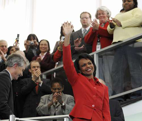 美國國務(wù)院十六日舉行了一場告別會,國務(wù)院全體職員均有出席。會上國務(wù)卿賴斯發(fā)表了一段主題為保衛(wèi)全球自由民主的重要性的簡短演說。然后,她向下屬們說:“你們永遠(yuǎn)都會留在我的腦海里、我的禱告里和我的心里!碑(dāng)時她面露微笑,但眼里泛著淚光,而且說話的聲音哽咽。語畢,臺下向她報以熱烈的歡呼和掌聲,她則步下臺階,與各個大使、外交官、安全官員等逐一握手并拍照留念,然后步出大門。