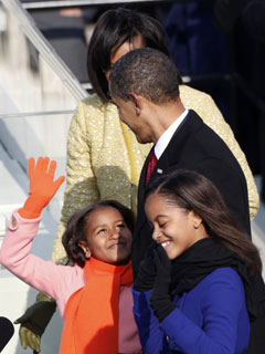奧巴馬兩個(gè)可愛(ài)的女兒10歲的馬莉婭和7歲的薩莎也成為變化的主人公。在就職典禮上,她們始終落落大方地面對(duì)人群和鏡頭,有禮貌地微笑并揮手。原本認(rèn)為黑人兒童就是“貧民窟里長(zhǎng)大的骯臟、聒噪的搗亂者”的成見(jiàn)也被徹底打破。