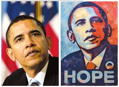 美國總統(tǒng)選舉期間,一張紅、白、藍三色相間的美國總統(tǒng)貝拉克·奧巴馬肖像廣泛傳播。圖片中,奧巴馬眼神堅定、面部略微上仰,與圖片下方“希望”字樣呼應。