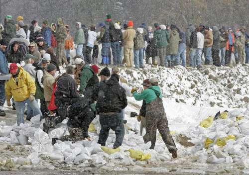 在27日早上,法戈市大約150戶居民已經(jīng)撤離,一些醫(yī)院、診所和學(xué)校也關(guān)閉,而數(shù)千名志愿人員及1700名國民警衛(wèi)軍冒寒堆放沙包,加固城市周邊的防洪帶,并準(zhǔn)備在防御物發(fā)現(xiàn)裂縫后作出通報。另外,在明尼蘇達(dá)州穆爾黑德市,約2660戶居民要緊急疏散。法戈市市長瓦拉克說,他們正在集中力量,全力搶救能夠保護(hù)的每件財產(chǎn)。法戈變成澤國的風(fēng)險十分高,因為該市未有發(fā)展上游區(qū)域城市的周延大型防洪系統(tǒng)。另外,北達(dá)科他州政府亦用炸藥炸開堵塞的冰塊,以疏通受阻而淹沒該州的洪水,并出動救難艇和直升機救出受困在各地的災(zāi)民。