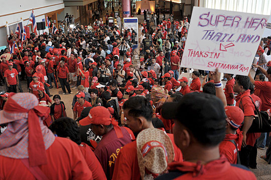 在會(huì)議中心外圍,早上一直堅(jiān)守在門口與四周的一隊(duì)隊(duì)軍警已經(jīng)不見蹤影,原先設(shè)置的鐵架障礙物與鐵絲網(wǎng)也被挪開,舉目所及,酒店的庭院里、樹蔭下、停車場都是人頭攢動(dòng)的“紅衫軍”,他們高舉著要求阿披實(shí)總理辭職的招牌,吶喊不停。