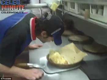 報道稱,這兩名員工用攝像機(jī)進(jìn)行了自拍,并將錄像放到了網(wǎng)上,引起軒然大波。錄像中,一名男員工正在做三明治,他把一小塊奶酪抹在自己的鼻孔,然后又得意忘形的把這塊奶酪放進(jìn)了三明治中。隨后,他還將一段臘腸放在自己的屁股后,疑似在上面放屁。