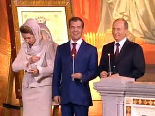 據(jù)俄羅斯新聞網(wǎng)報道,俄總統(tǒng)梅德韋杰夫和總理普京20日出席了在莫斯科救世主大教堂舉行的復(fù)活節(jié)祈禱儀式。然而,負責(zé)轉(zhuǎn)播節(jié)目解說的主持人在交代出場人物時將梅德韋杰夫和普京的頭銜混淆互換,這樣的口誤讓收看節(jié)目的觀眾忍俊不禁。