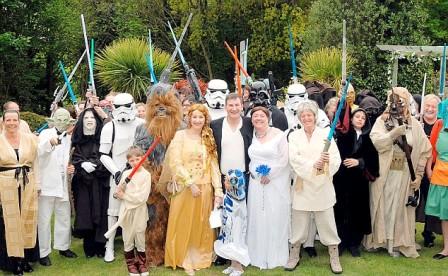 中新網(wǎng)5月6日電 綜合外電報(bào)道,英國(guó)一對(duì)喜愛《星球大戰(zhàn)》的超級(jí)影迷夫婦4日舉行了一場(chǎng)“星戰(zhàn)婚禮”,親朋好友全都裝扮成影片中的人物“盛裝出席”,場(chǎng)面令人仿佛置身于那遙遠(yuǎn)的星系。