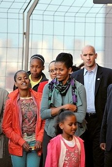 據(jù)臺灣中廣新聞網(wǎng)報道,10歲的瑪莉亞及7歲的莎夏這次是以美國總統(tǒng)家眷的身分第一次出國訪問,她們和母親在埃菲爾鐵塔參觀了大約四十五分鐘,游客看到美國第一家庭都興奮地大叫,并與她們打招呼,米歇爾則是微笑揮手響應(yīng)。