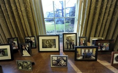 桌上的瓷器不見蹤影,代替的是歷史感強烈的美洲陶罐和器具;書架上出現(xiàn)的是馬丁•路德金在1963年華盛頓游行時發(fā)表的著名演說“我有一個夢的”的照片;而在總統(tǒng)辦公桌后面的桌上則擺滿了奧巴馬和家人的照片。