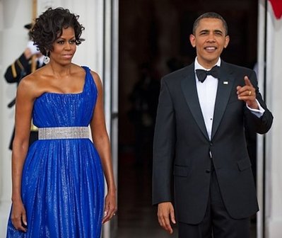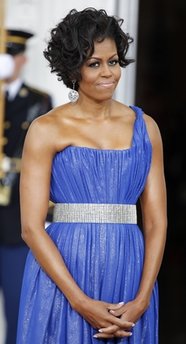 當(dāng)晚,奧巴馬夫人米歇爾再次閃亮登場,其著裝打扮又被眾媒體拿來評點一番。米歇爾穿了亮藍(lán)色單肩拖地長裙,腰間系上銀色腰帶,并佩戴了銀色耳環(huán)。