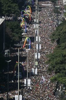 中新網6月7日電 據外電報道,巴西城市圣保羅周日(6日)舉行一年一度的同性戀大游行,組織者稱這是世界上規(guī)模最大的此類游行。