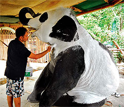 這張照片配上標(biāo)題“泰國大象只能露齒微笑并忍受”,特別引人深思。報(bào)道說,水彩對大象無害,大象似乎也不介意。工人慢慢地在大象身上仿造全國對熊貓的狂熱。