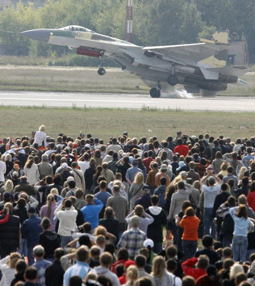 圖片是8月22日周六在航展上蘇-35飛行資料圖。有參觀者還誤以為是俄新式戰(zhàn)機(jī)在進(jìn)行特技表演。照片清楚顯示,飛機(jī)降落時發(fā)生傾斜,靠右側(cè)起落架落地。駕駛該飛機(jī)的是第一個(2008年2月)駕駛蘇-35的飛行員謝爾蓋•伯格達(dá)。(梁小逸)