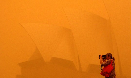 澳洲東部星期三遭遇數(shù)十年來(lái)最嚴(yán)重的沙塵暴,悉尼市被覆蓋,交通受阻。強(qiáng)風(fēng)把數(shù)以噸計(jì)的紅色沙塵傾倒在澳洲最大城市悉尼,使悉尼覆蓋在怪異的赤色迷霧中,著名悉尼歌劇院被涂上一層厚厚的沙塵。