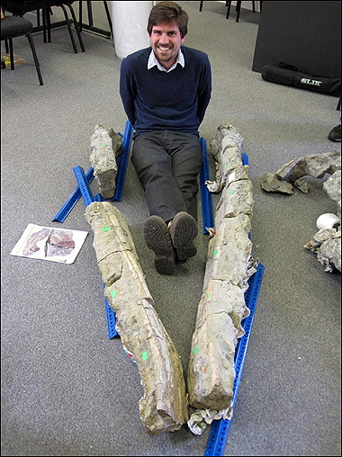 考古學(xué)家拼湊完畢后,才發(fā)現(xiàn)它原來屬于一頭恐龍的遺骨。而它體型之大,更是前所未見。強(qiáng)有力的下鄂,可以一口吞下整個(gè)人,或是把一輛汽車咬成兩半。
