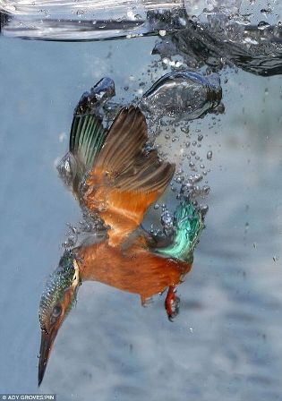 翠鳥(niǎo)的俯沖速度每小時(shí)達(dá)40公里,能捕捉到水下60厘米處的魚,通常只能看到一個(gè)藍(lán)點(diǎn)一閃,它們就鉆進(jìn)了水里。由于翠鳥(niǎo)的眼睛能迅速調(diào)整水中光線所造成的視角反差,因此翠鳥(niǎo)捕魚幾乎是百發(fā)百中。