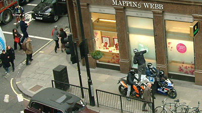 中新網(wǎng)3月10日電 據(jù)外電9日報道,五名騎摩托車的“劫匪”停在珠寶商店門前,用大錘砸碎商店櫥窗,在眾目睽睽之下?lián)屪邇r值5萬英鎊的珠寶。這一驚人的場景日前就發(fā)生在英國倫敦著名的“珠寶一條街”上。