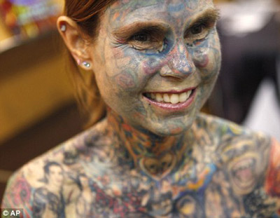 希努斯又被人們叫作“插圖女”。她身上的圖案類型豐富,有叢林景色,還有她最喜歡的演員的肖像畫。起初,希努斯開始紋身是因?yàn)樗加邢忍煨缘倪策。灰娞柶つw就會(huì)發(fā)皰、留疤。她紋身后雖然病情沒有好轉(zhuǎn),但是這些紋身蓋住了身上的傷疤,她也可以暴露在太陽下了。后來,隨著紋身面積不斷擴(kuò)大,她深陷其中不能自拔。在博覽會(huì)上她提到她所有的紋身都是同一位大師的杰作。