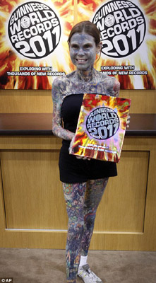 中新網(wǎng)5月27日電 據(jù)英國媒體報(bào)道,美國女孩希努斯(Julia Gnuse)全身95%都覆蓋著五顏六色的紋身。她也被吉尼斯世界紀(jì)錄評(píng)為世界上紋身最多的女人。5月26日,她出席了紐約圖書博覽會(huì),也展示了自己身上的紋身。