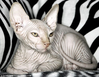 斯芬克斯貓是2005年認(rèn)定的稀有品種,它們無毛,滿身褶皺。斯芬克斯貓脾氣很好,而且在某些方面它們更像狗,比如,容易與人親近而且對人忠誠。但是這種貓也需要些特殊保護。比如在夏天,主人需要給它們涂抹防曬霜以免曬傷;在冬天則需要給它們添加衣物來遮體保暖。斯芬克斯貓通常能活到9—15歲。