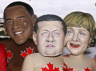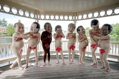 來(lái)自加拿大樂(lè)施會(huì)組織的幾名成員裝扮成八國(guó)首腦,他們帶上奧巴馬、默克爾等領(lǐng)導(dǎo)人的面具,身穿肉色緊身衣,看上去仿佛“赤身裸體”,而關(guān)鍵部位則用一片加拿大特有的紅葉遮羞。他們?cè)阽R頭前搔首弄姿、大擺pose,欲以此嘲諷G8峰會(huì)。