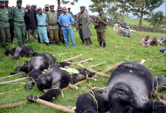 僅2007年6、7兩月就有7頭大猩猩被屠殺,而一頭名為Senkwekwe、重達500磅的銀背大猩猩的遇害照片更令村民們悲痛不已。除200只珍稀猩猩被殺害,森林砍伐加速,自然資源流失,更令人發(fā)指的是,過去10年共有150多名護林隊員在剛果民主共和國東部地區(qū)的五個公園中被謀殺。
