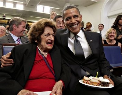 中新網8月5日電 8月4日是美國總統(tǒng)奧巴馬48歲生日。他于下午白宮舉行例行記者會時,意外來到新聞簡報室,手上捧著一盤蛋糕,送給也于當天過生日的最資深記者海倫-湯瑪斯。