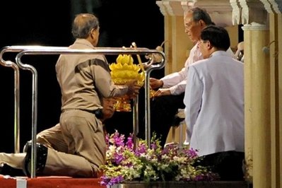 81歲的泰王普密蓬在王后詩麗吉、哇集拉隆功王儲、王室家庭成員以及首相阿披實(shí)的陪同下,出席了該活動。他身穿一件白色的外套,坐在輪椅上向數(shù)百名前來為他祈福的民眾揮手。