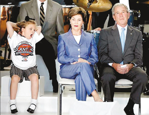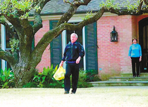 布什經(jīng)常被勞拉打發(fā)上街買雜物,或者帶著寵物狗巴尼在社區(qū)閑逛,提著塑料袋親自為狗“善后”。閑暇時間布什還經(jīng)常和勞拉一起去看看球賽,參加社區(qū)活動。