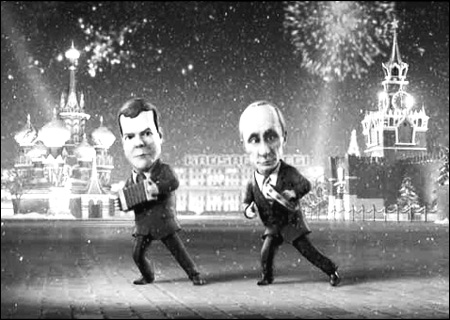元旦夜晚,俄羅斯國(guó)家電視臺(tái)第一頻道突然出現(xiàn)了總統(tǒng)梅德韋杰夫和總理普京的形象,只是這次他們變成了3D卡通玩偶。在時(shí)長(zhǎng)兩分半鐘的短片中,左邊的梅德韋杰夫拉著手風(fēng)琴,右邊的普京手搖鈴鼓,兩人在紅場(chǎng)上邊唱邊跳,共同評(píng)說2009年,不但諷刺了烏克蘭天然氣事件,還把梅、普共治體制幽默了一把。