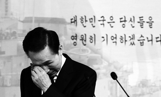 “身為總統(tǒng),我要將天安艦沉沒原因一查到底,徹底查明真相……”說到這里,身著黑色西裝的李明博聲音開始哽咽,隨后他從右邊褲兜中掏出藍(lán)色的手絹擦了擦鼻子,然后繼續(xù)語(yǔ)氣堅(jiān)定地說:“調(diào)查結(jié)果出來后,我們要堅(jiān)定不移地采取果斷措施!