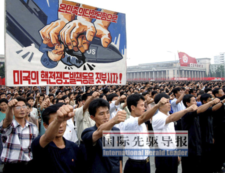 今年的6月25日是朝鮮戰(zhàn)爭(zhēng)爆發(fā)59周年紀(jì)念日,也是朝鮮的“反美斗爭(zhēng)日”。前兩年,朝鮮在平壤體育館舉行規(guī)模相對(duì)較小的“反美斗爭(zhēng)日”群眾大會(huì),而今年則改在金日成廣場(chǎng)舉行,參加大會(huì)的人數(shù)達(dá)到10萬(wàn)名!秶(guó)際先驅(qū)導(dǎo)報(bào)》記者應(yīng)邀參加了這次大會(huì)。偌大的廣場(chǎng)上紅旗招展,人頭攢動(dòng)。“消滅朝鮮人民的不共戴天的敵人——美帝侵略者”、“趕走美帝,統(tǒng)一祖國(guó)”、“在反美大決戰(zhàn)中顯示英雄的朝鮮人民的本色”等標(biāo)語(yǔ)和宣傳畫(huà)隨處可見(jiàn)。
