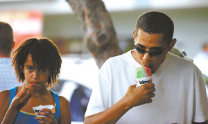 果然,美國總統(tǒng)這次又選擇了這種混合檸檬、櫻桃以及熱帶水果糖漿的刨冰,沒有再加紅豆和奶油等點綴!拔蚁矚g直接吃這種冰,不需要其他裝飾,”奧巴馬指著菜單上的“雪巴馬”字樣笑著告訴記者。