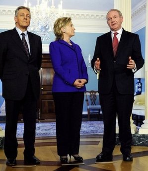 據(jù)報(bào)道,在近日的圣帕特里克節(jié)(St Patricks Day)招待會(huì)上,奧巴馬特地對(duì)民主統(tǒng)一黨黨首、北愛首席部長(zhǎng)彼得•羅賓遜(Peter Robinson)以及新芬黨黨首、北愛副首席部長(zhǎng)馬丁•麥吉尼斯(Martin McGuinness)提出表?yè)P(yáng)。奧巴馬說(shuō),“我想要向第一部長(zhǎng)彼得羅賓遜和副首席部長(zhǎng)馬丁•麥吉尼斯的杰出領(lǐng)導(dǎo)和他們一直以來(lái)樹立的榜樣致敬”。