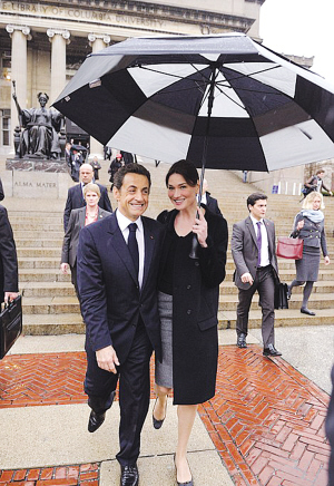 法國娛樂雜志的網(wǎng)站用頭條報(bào)道薩科齊夫婦到訪紐約,紐約給了薩科齊在自己的國家,也好久沒有感受到的關(guān)注,哥倫比亞大學(xué)學(xué)生的熱情,更讓薩科齊心情大好,他放棄事先準(zhǔn)備好的講稿,改說肺腑之言。從薩科齊在哥倫比亞大學(xué)演講的安排,就可以看得出來法國人是多么注重外在美。薩科齊在哥倫比亞演講的白色講臺和通往講臺的淺灰色地毯,都是他自己從法國帶去的。薩科齊穿深藍(lán)西裝、打黑領(lǐng)帶,布呂尼穿黑上衣、配灰裙子,加上黑白相間的花傘,看得出來是經(jīng)過刻意搭配,和地毯與講臺呼應(yīng)。
