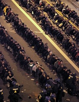 近日來(lái),在哥本哈根舉行的示威活動(dòng)大部分是和平的,但是在當(dāng)天的集會(huì)中,有數(shù)百名身穿黑衣的年輕人在街上投磚頭,砸窗戶,警方對(duì)此進(jìn)行了干預(yù)。防暴警察包圍了鬧事者,要求他們坐在地上,把手放在身后,然后被集體押上警車。