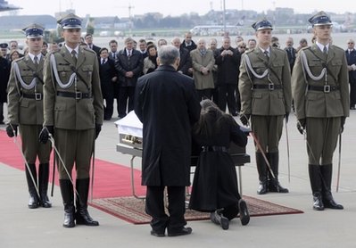 卡欽斯基的靈柩11日由一架波軍直升機(jī)從撞機(jī)地點(diǎn)俄羅斯斯摩棱斯克運(yùn)返波蘭首都華沙,代理總統(tǒng)科莫羅夫斯基、總理圖斯克等官員在場(chǎng)迎接,以一場(chǎng)簡(jiǎn)短的宗教儀式向其致祭。靈柩將會(huì)由軍隊(duì)護(hù)送到總統(tǒng)府,稍后,當(dāng)局將會(huì)把總統(tǒng)府開(kāi)放,讓民眾進(jìn)入瞻仰卡欽斯基的遺容。