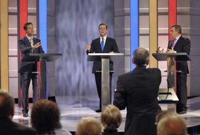 中新網(wǎng)4月16日電 據(jù)法新社報道,英國三大政黨黨首15日舉行英國有史以來首場選舉電視辯論,事前不那么被看好的自由民主黨黨首克萊格爆冷贏得首場辯論,在辯論后的民意調(diào)查當中戰(zhàn)勝執(zhí)政黨工黨黨首布朗和在野保守黨黨首卡梅倫。