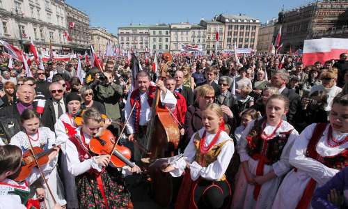 當(dāng)靈車緩慢穿過克拉科夫狹窄街道時(shí),哀悼者為卡欽斯基夫婦鼓掌、拋花和揮舞波蘭國(guó)旗?J斯基夫婦的遺體,是用飛機(jī)從華沙運(yùn)抵這里的。