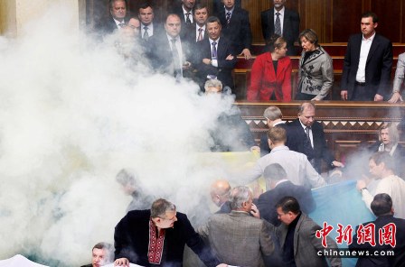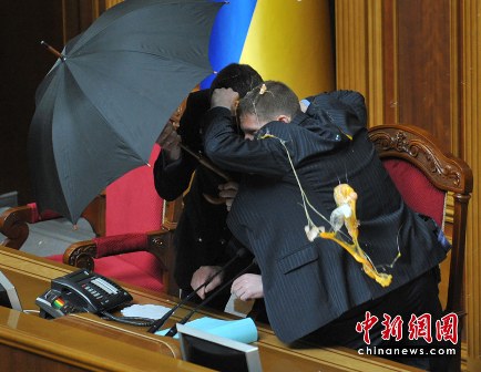 27日,烏克蘭最高拉達召開會議,討論是否通過俄黑海艦隊駐烏克蘭克里米亞半島的租期延期協(xié)議,但會議現(xiàn)場一度發(fā)生騷亂。議長利特溫被反對派議員用雞蛋打,不得不撐開黑傘躲在后面,F(xiàn)場還發(fā)生了肢體沖突,人們扭打在一起,一片混亂。更有人趁亂在議會廳內放置至少二顆煙霧彈,導致大廳被一片濃煙籠罩,大家紛紛捂住口鼻。
