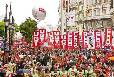 西班牙公務(wù)員前晚在全國發(fā)動(dòng)60場大游行,抗議政府緊縮計(jì)劃。工會(huì)稱,全國260萬公務(wù)員中,3/4參加了示威,但政府指只占11%。首都馬德里有數(shù)千人參加游行,一名丈夫失業(yè)的女教師說,本月薪酬被削減150歐元,一想起便哭,家中儲(chǔ)蓄正被蠶食。