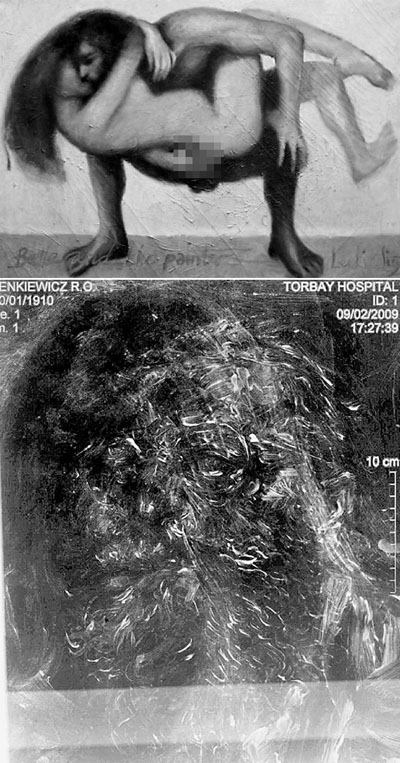中新網(wǎng)6月23日電 據(jù)香港《文匯報(bào)》23日援引外電報(bào)道,英國(guó)一名藝術(shù)品收藏家于2003年以8500英鎊買入一幅已故畫家羅伯特-林克維科茨與女模特兒赤裸的自畫像(上圖)。該名收藏家聽(tīng)取專家意見(jiàn),把畫拿去醫(yī)院進(jìn)行X光掃描,竟發(fā)現(xiàn)畫中有畫,油畫之下蓋另一幅流浪漢肖像畫(下圖),之前從未被拍賣過(guò),估計(jì)價(jià)值逾5萬(wàn)英鎊。收藏家相信羅伯特-林克維科茨用畫蓋另一幅畫是另有目的。