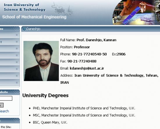 根據(jù)戴尼斯鳩的官方自傳,他曾在英國“倫敦學(xué)院”獲得航空和航天工程博士學(xué)位。問題是,英國根本就沒有這樣一所大學(xué)。Mowjcamp推測說,戴尼斯鳩的意思可能是指英國“帝國理工大學(xué)”,那所學(xué)校確實有航空學(xué)院。但戴尼斯鳩在德黑蘭工業(yè)科技大學(xué)網(wǎng)站上的簡歷卻與此不同,網(wǎng)上說,他在瑪莉皇后學(xué)院(倫敦大學(xué)的最大學(xué)院之一)獲得學(xué)士學(xué)位。