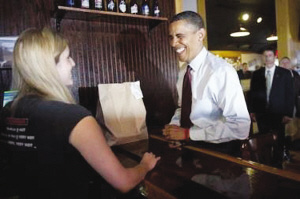 當天,奧巴馬原定在水牛城發(fā)表一份有關國內(nèi)經(jīng)濟形勢的演講。午飯時間,總統(tǒng)車隊臨時停在一家小吃店。