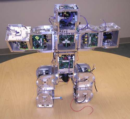 南加州大學(xué)多形態(tài)機器人學(xué)實驗室兩年多前開始研發(fā)這款“超級機械人”(Superbot)。它是由一百塊模塊組成,目前僅完成了頭二十塊。它雖然不能真的像《變形金剛》電影中的機械人那樣變成貨車或“F-22”戰(zhàn)斗機,但它的變身能力仍令人咋舌:它可以“長出”一對、兩對或三對“腿子”,可以像蛇那樣滑行,也可以像毛蟲那樣蠕動。其中六塊模塊可以形成履帶,有些組合還可以舞動繩子。研究主管沈偉明(音譯)稱:“它要攀爬時可以長出腿子,要下山時則可以變成球狀或者索性滾下去!迸c賓夕法尼亞大學(xué)去年展出的模塊機械人相似,它解體后能夠自我修復(fù)和自我重裝:每個模塊儼如一個獨立的機械人,而且可以利用紅外線和無線電訊息互相“對話”;它們又會一直評估周遭情況,包括附近有沒有其它模塊,以及它們本身是否需要變成手腳。